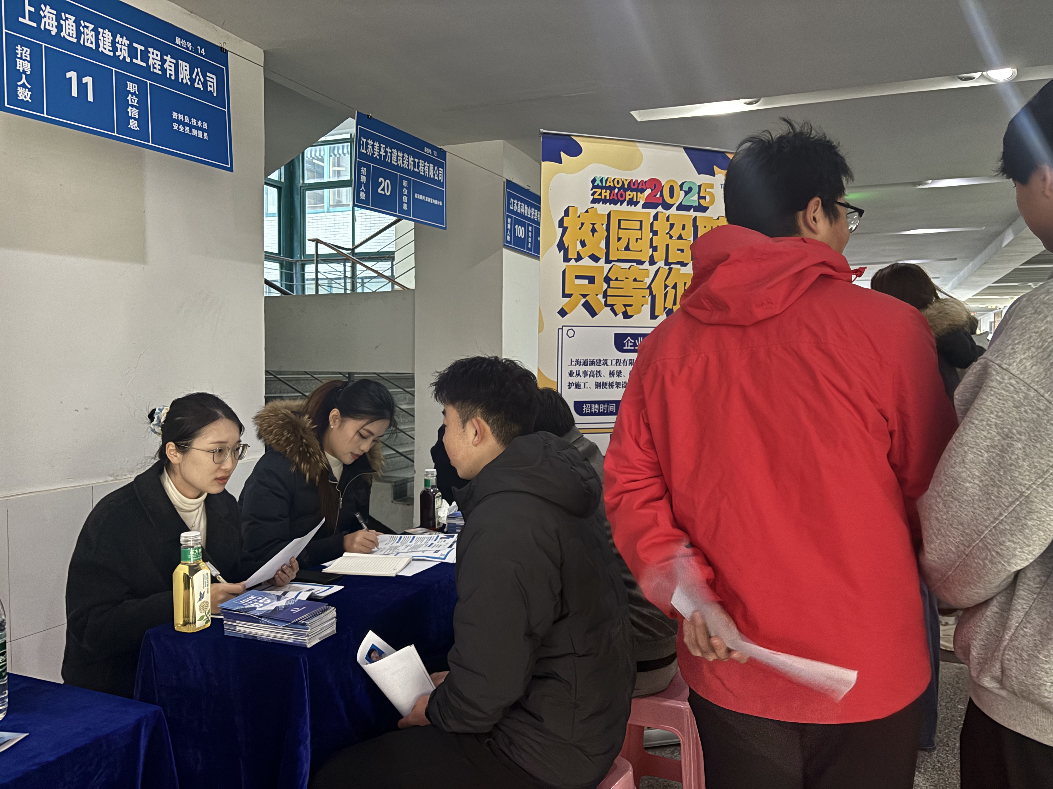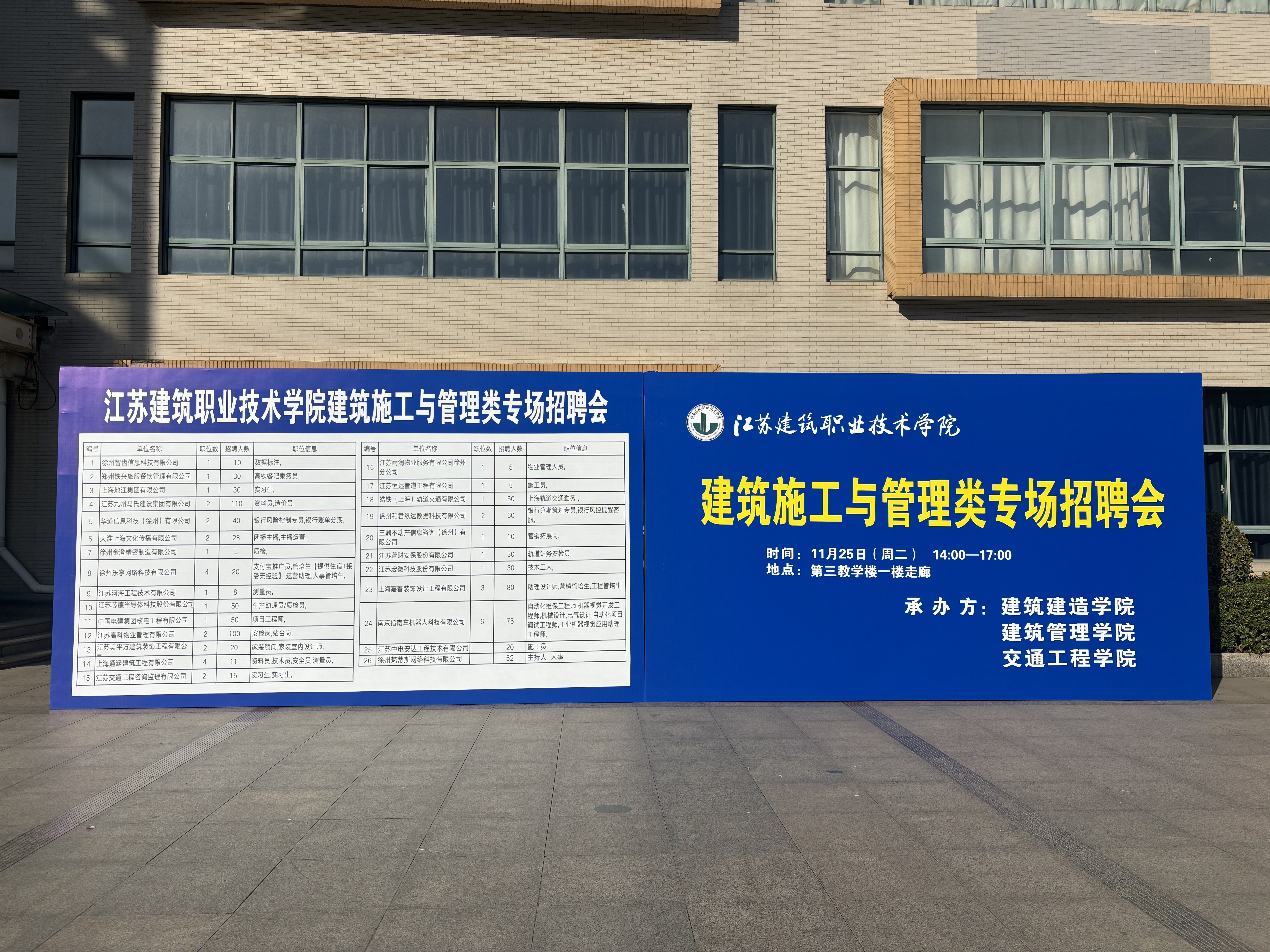 11月25日,由建筑建造学院、建筑管理学院与交通工程学院联合举办的“江苏建筑职业技术学院建筑施工与管理类专场校园招聘会”在教三楼一楼走廊顺利举行。江苏中电安达工程技术有限公司、江苏河海工程技术有限公司、中国电建集团核电工程有限公司、上海通涵建筑工程有限公司等28家优质企业应邀参会,为2026届毕业生提供了丰富多样的就业岗位资源。