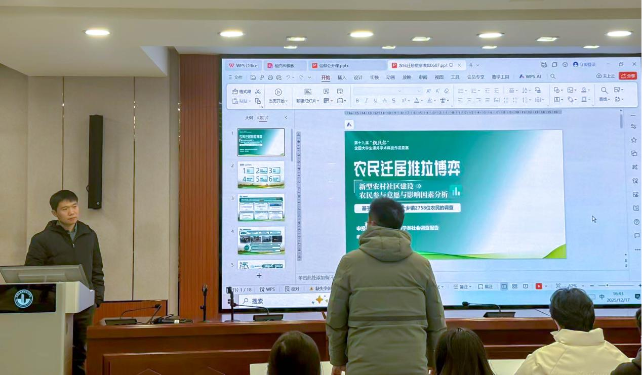 随后,马老师围绕“挑战杯”哲学社科类社会调查赛项,进行了细致讲解。内容涵盖选题策略、方案设计、方法选择、数据收集与分析、报告撰写及伦理规范等方面。他结合我院优秀案例,生动阐释了如何从社会现象中提炼研究问题,如何通过问卷、访谈、观察等方式获取有效信息,以及如何对材料进行深度解读与理论提升。